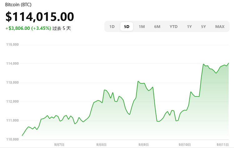 BTC 当前价格约 $114,015,日内上涨约 2.62%,日内最低触及 $110,951,最高约 $114,253。