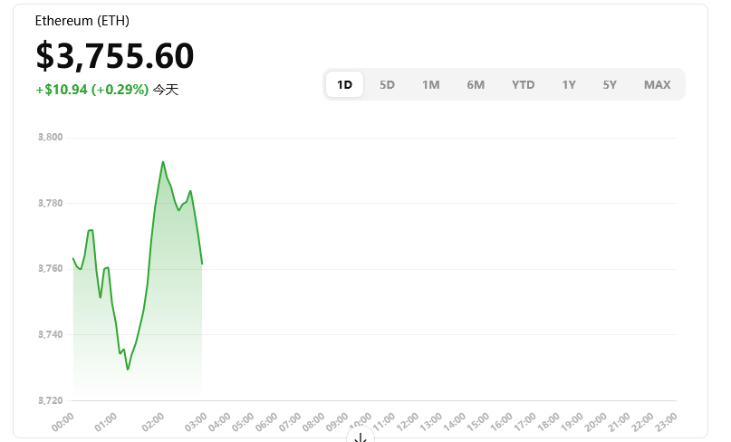 ETH 日内回调后现报约 $3,755,维持在 $3,700–$3,800 高位整合格局 TradingView +13 InvestingHaven +13 CoinCentral +13 CryptoRank +1 CoinCentral +1。
