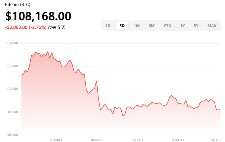 当前价格约 $108,168,日内下跌约 1.04%。